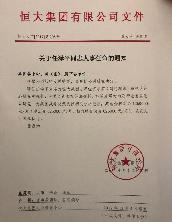 根据恒大集团文件显示,任泽平确认加入恒大集团,担任恒大集团首席经济学家(副总裁级)兼恒大经济研究院院长,年薪为税前1500万元。